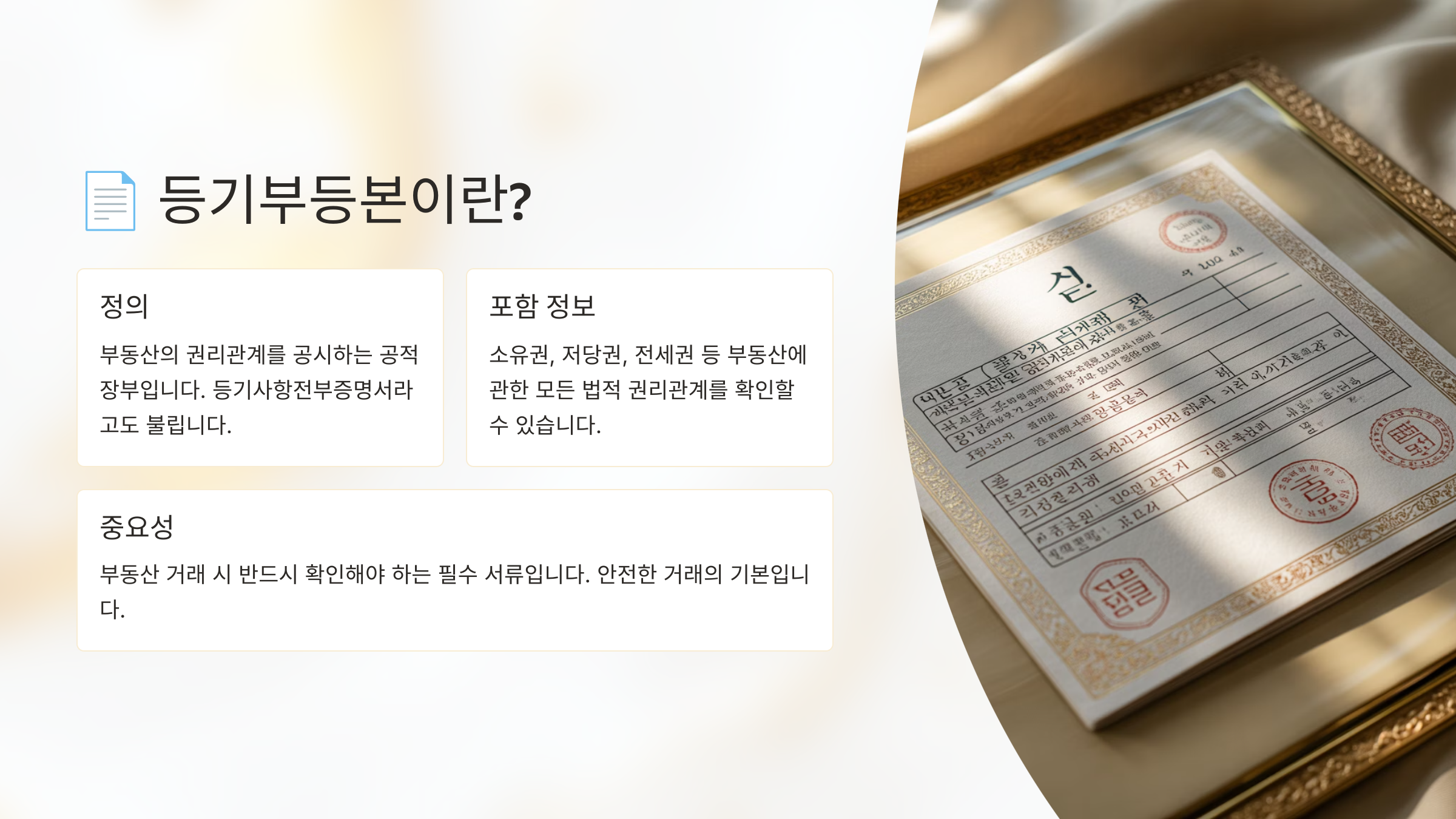 문서에는 소유권, 저당권, 전세권, 압류 등 중요한 정보가 상세하게 기록돼 있어서 부동산의 상태를 정확히 파악할 수 있어요.