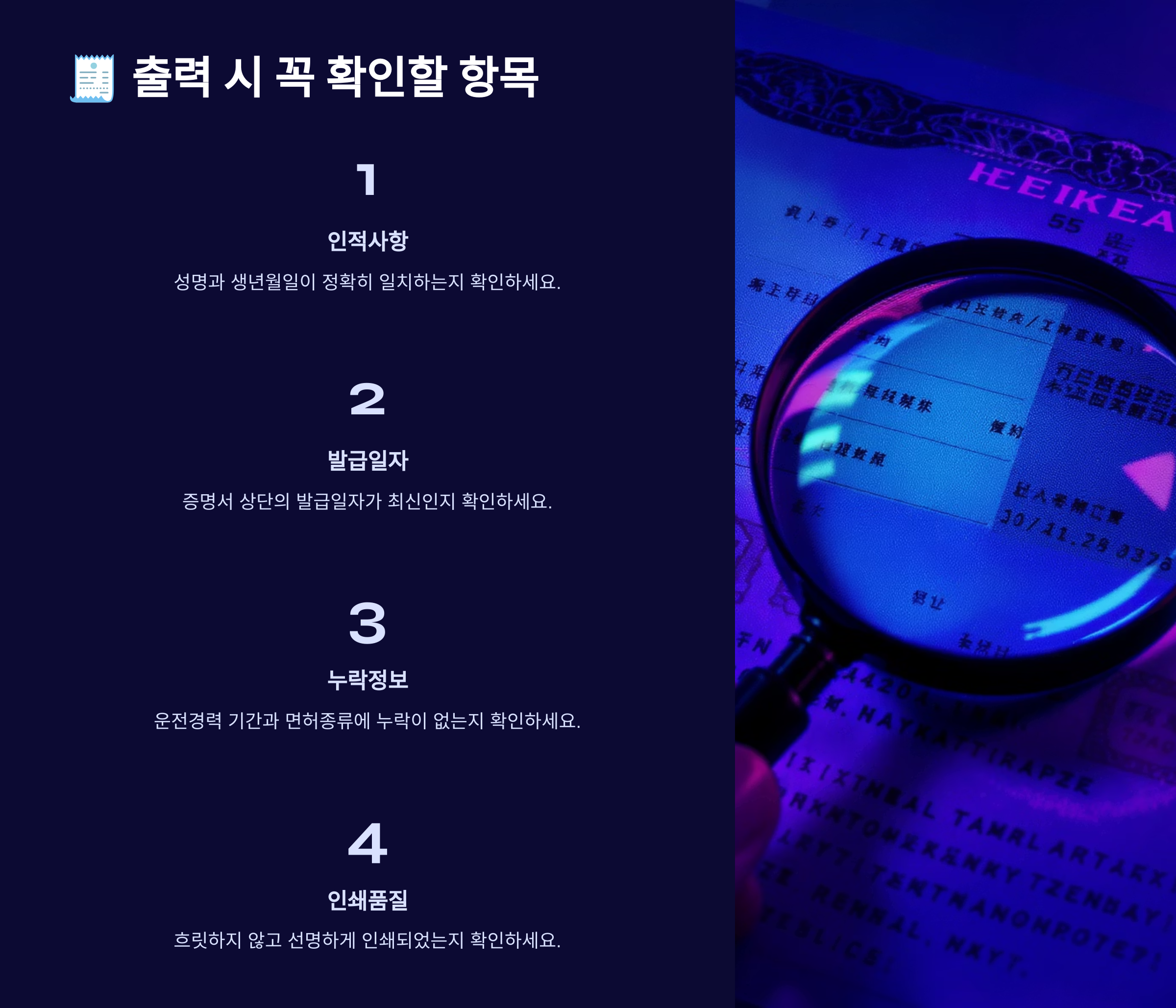 운전경력증명서를 출력할 때는 몇 가지 필수 확인사항이 있어요. 이걸 체크하지 않으면 서류가 무효 처리될 수 있답니다!